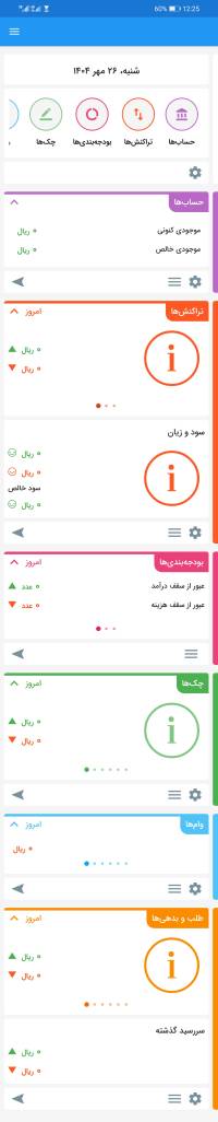 همانطور که می‌بینید، به راحتی چند حساب تعریف شده است. در زیر صفحه، موجودی کنونی و موجودی خالص مشاهده می‌شود. موجودی کنونی مجموع حساب‌هایی است که مشاهده می‌کنید. در کنار این بخش آیکنی موجود است که در صورت تمایل می‌توانید بخش مجموع را مخفی کنید.