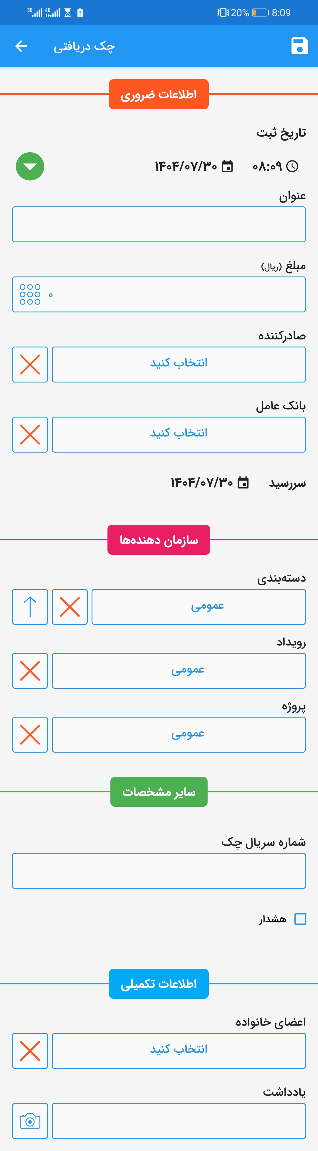 تاریخ ثبت: این تاریخ تاریخ ثبت چک در برنامه بوده ارتباطی به تاریخ وصول چک ندارد. سررسید چک در بخش مختص به خود تعریف میشود که در ادامه آورده خواهد شد.