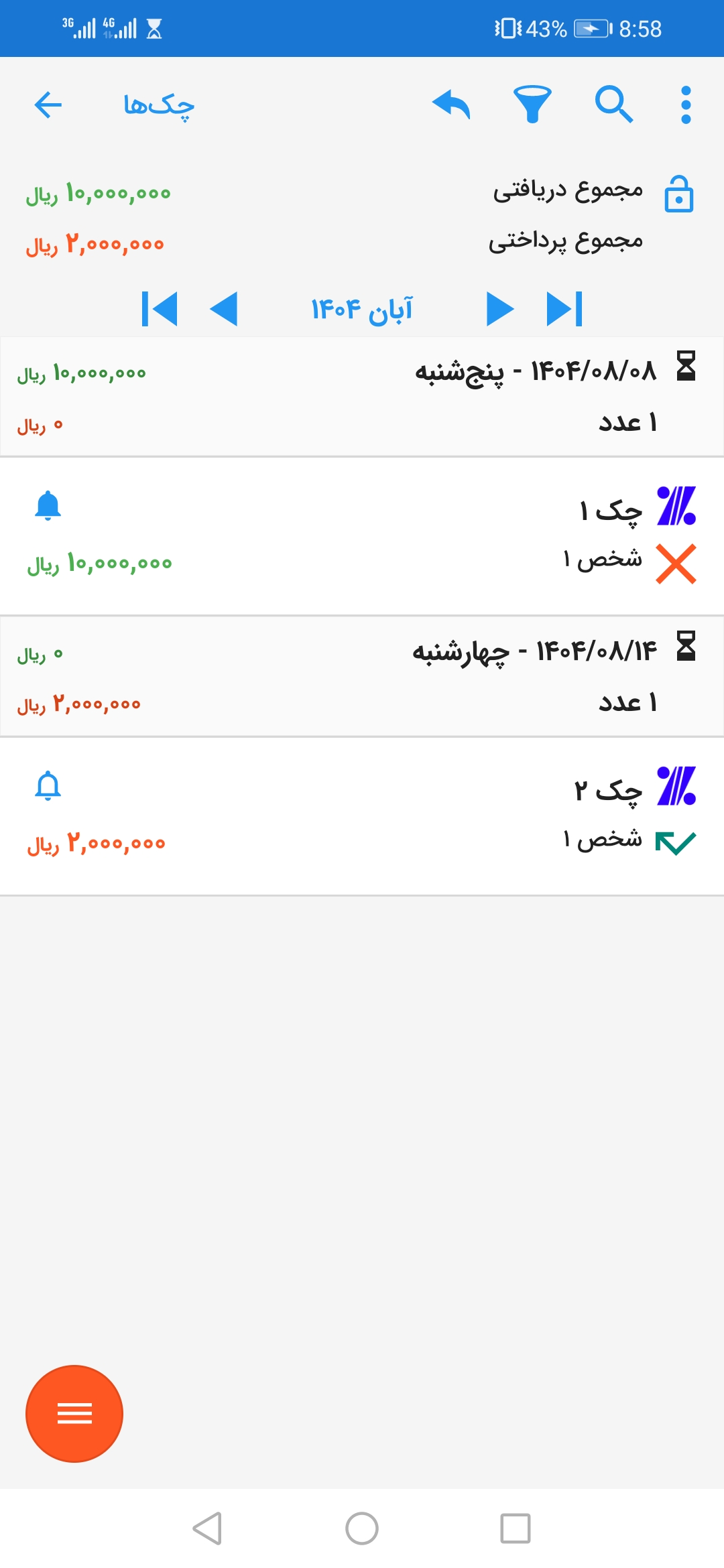 چکها در حالتی که بر اساس تاریخ نمایش داده میشوند، در تاریخ سررسیدشان قابل مشاهده هستند، نه تاریخ ثبت. پس در صورتی که چک جدیدی ثبت کردید، آن را در تاریخ سررسید جستجو کنید. اگر زمان سررسید را به خاطر ندارید، آیکن فیلتر را لمس کرده و گزینۀ «بدون محدودیت زمانی» را انتخاب کنید تا تمام چکها را ببینید.